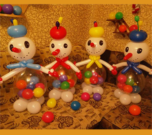 Елки,снеговики, подарки, Снегурочка с Дедом Морозом и снежинки.