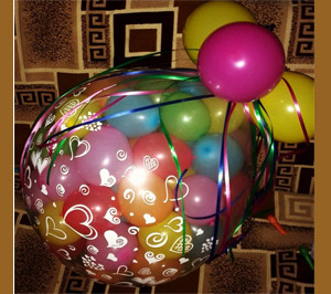 Шар-сюрприз подвешивается к потолку, затем ,когда детки собираются под ним ,лопается острым предметом!